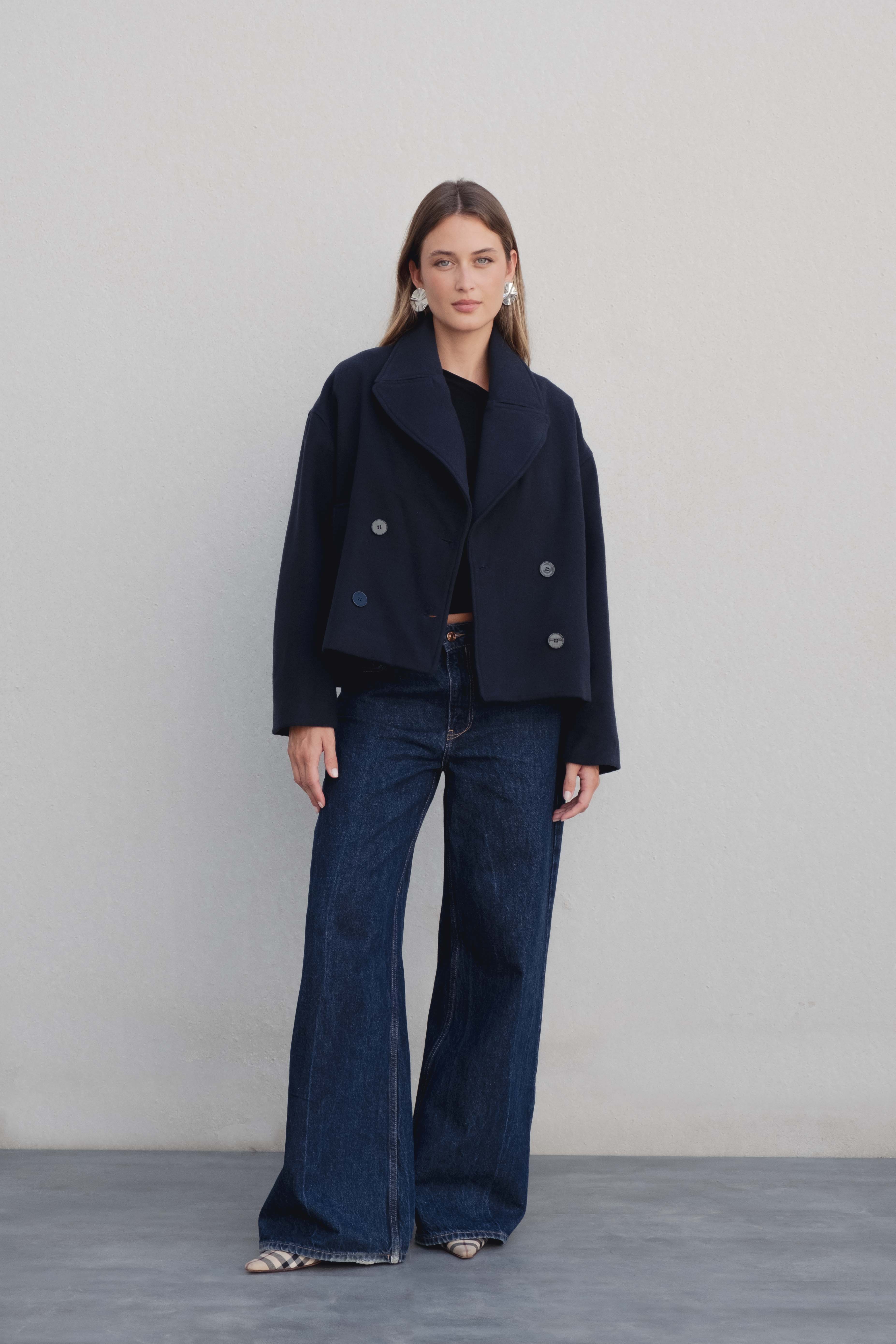 Abrigo corto con cuello solapa y manga larga. Bolsillos con solapa. Forro interior. Cierre frontal cruzado con botones.