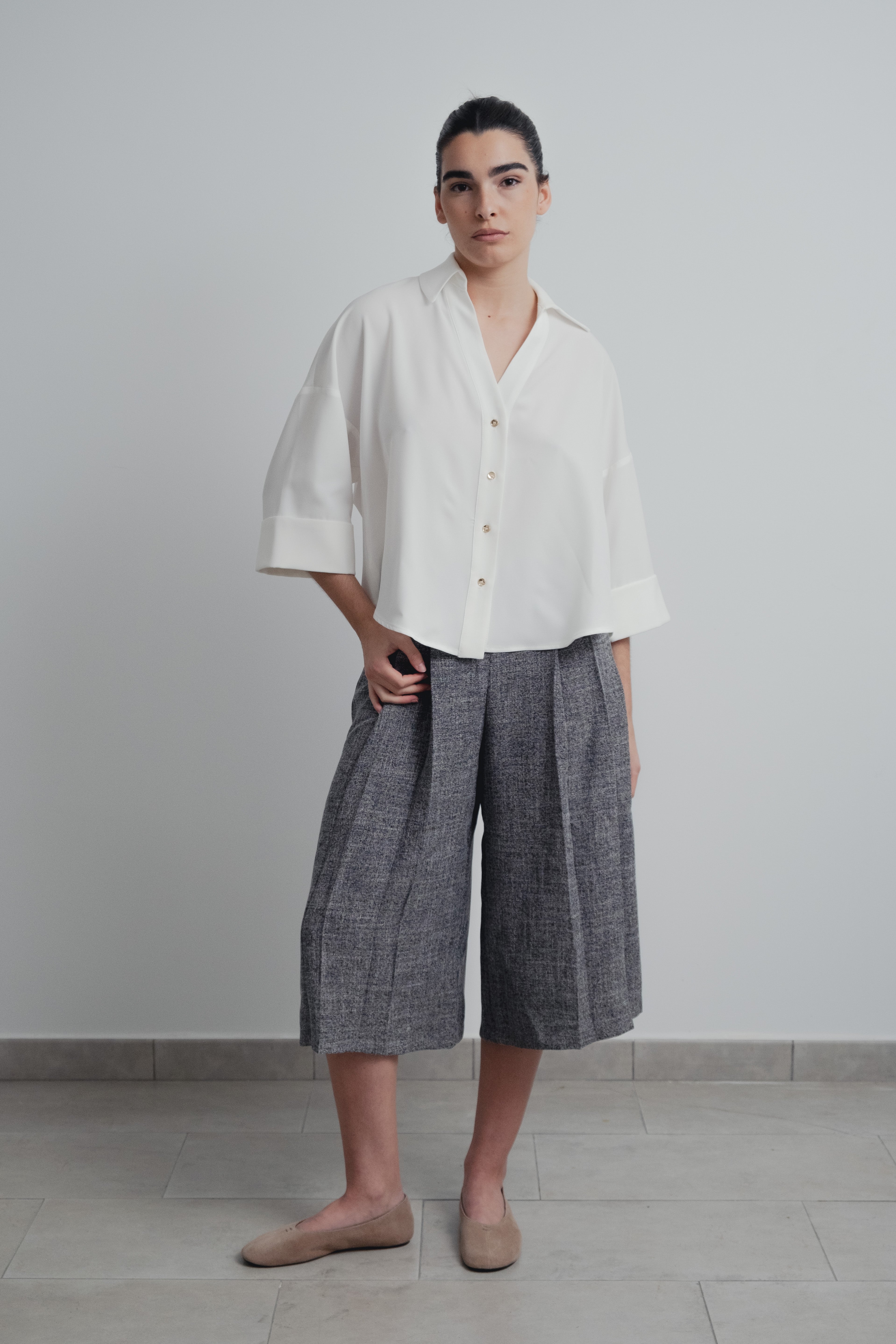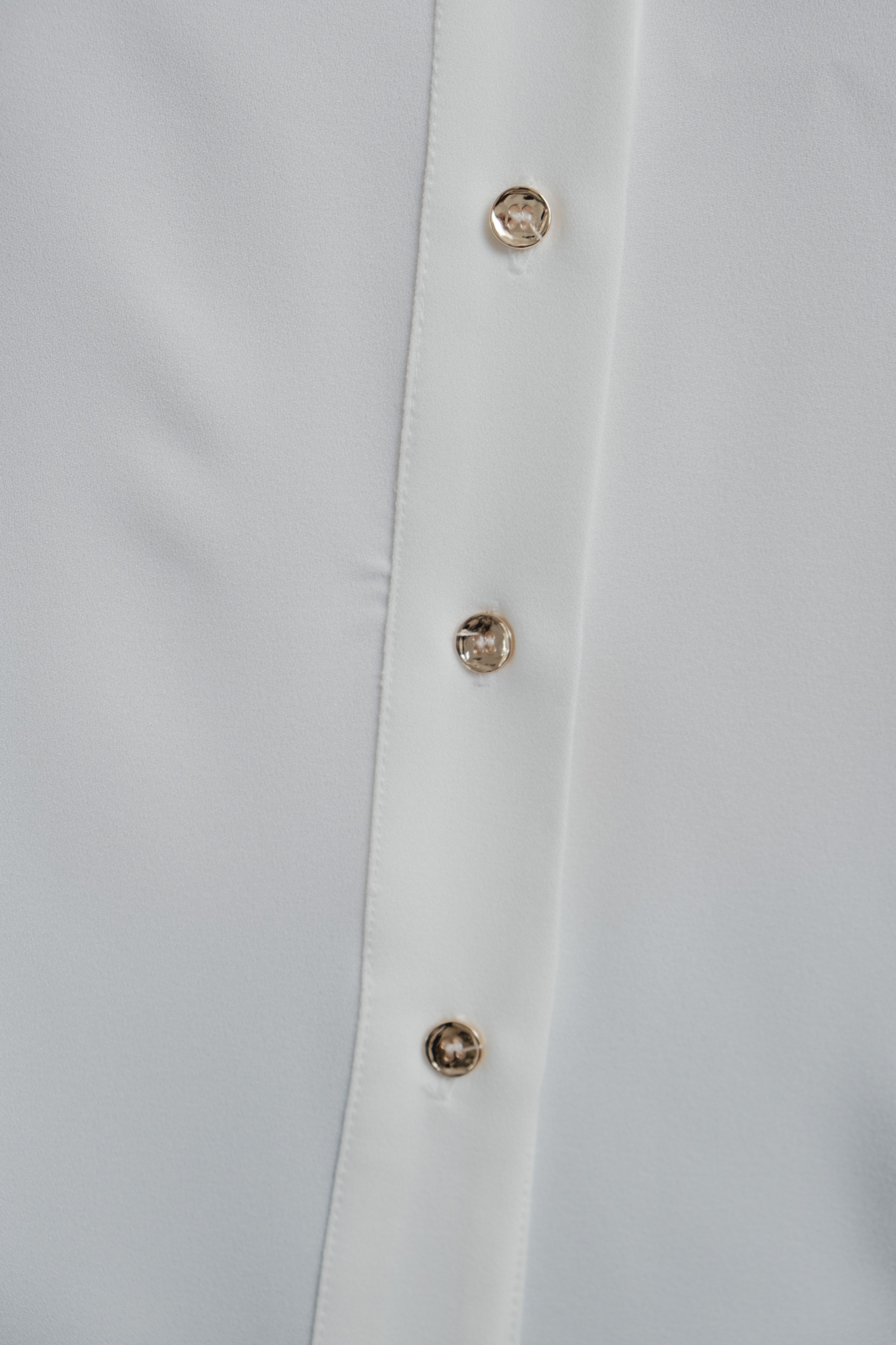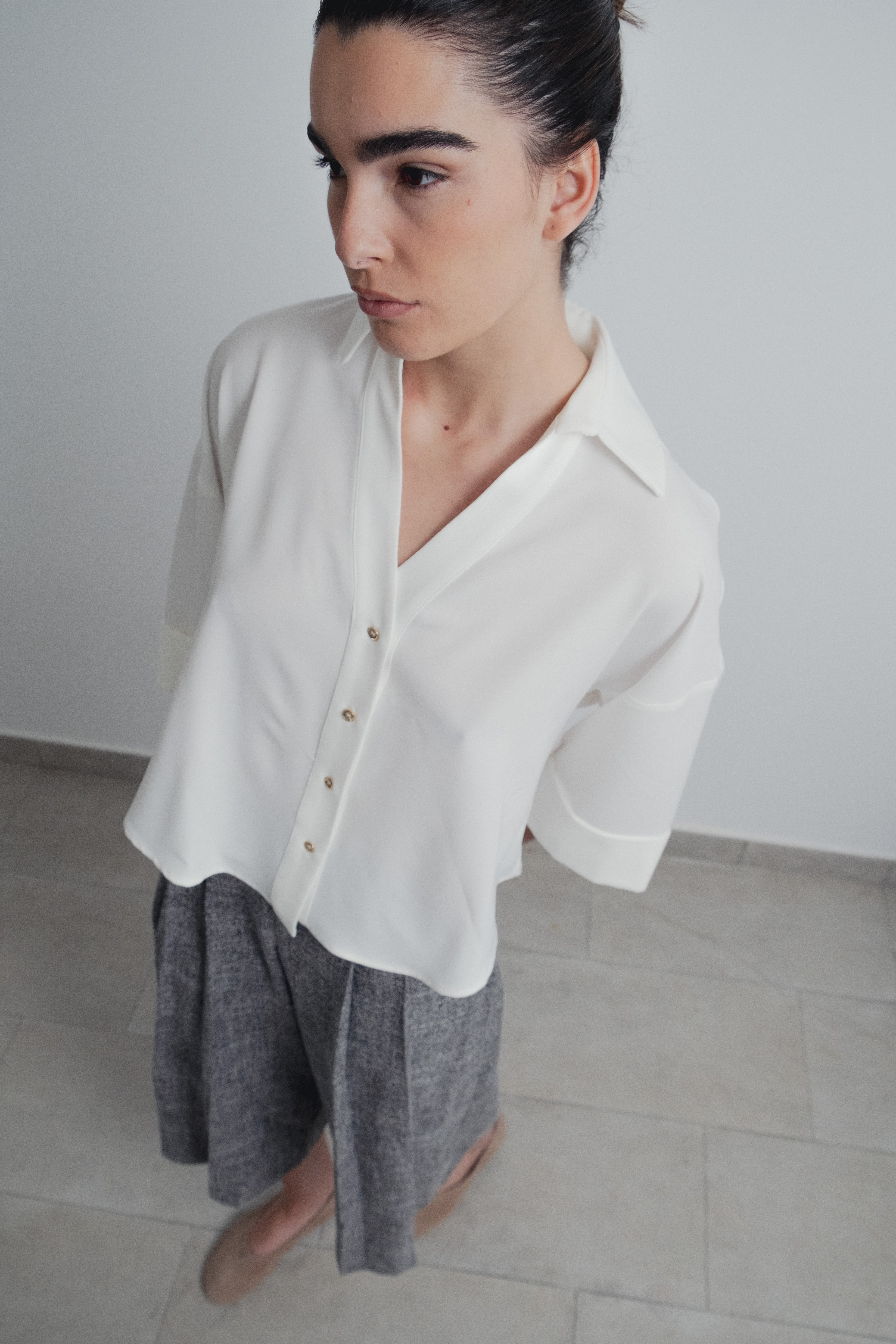 Camisa de cuello solapa y escote pico. Manga por debajo del codo acabado en vuelta. Bajo asimétrico. Cierre frontal con botones a contraste.