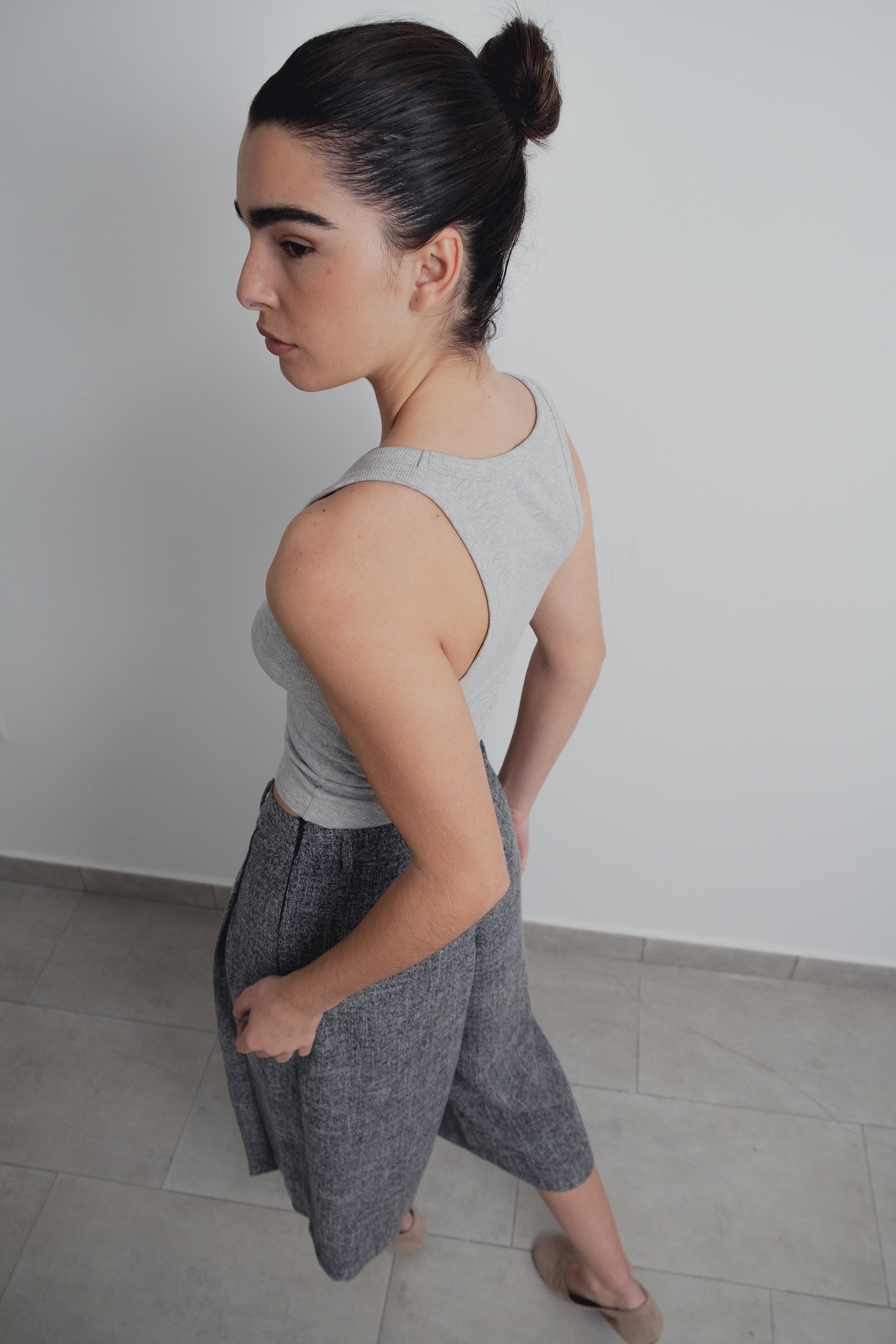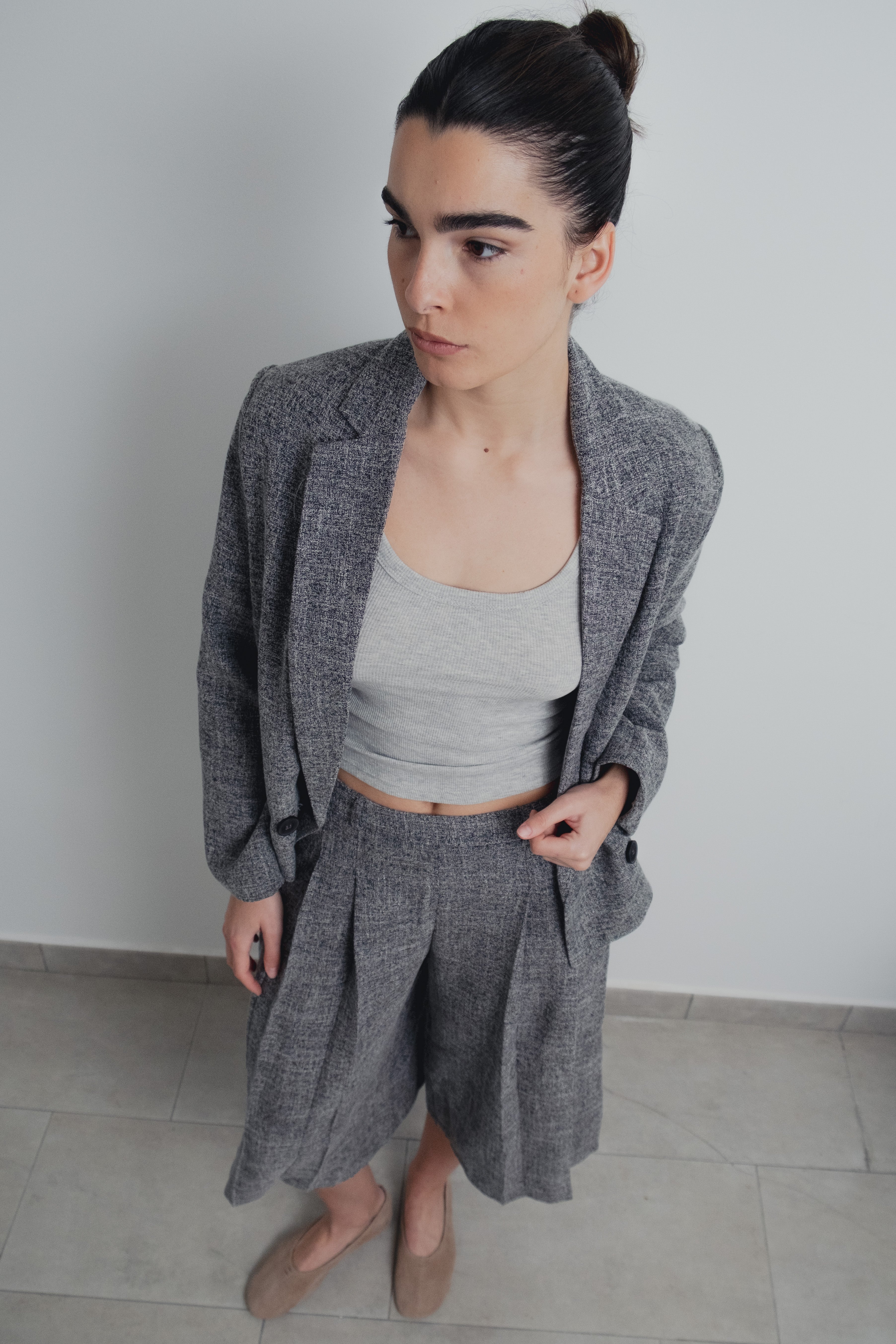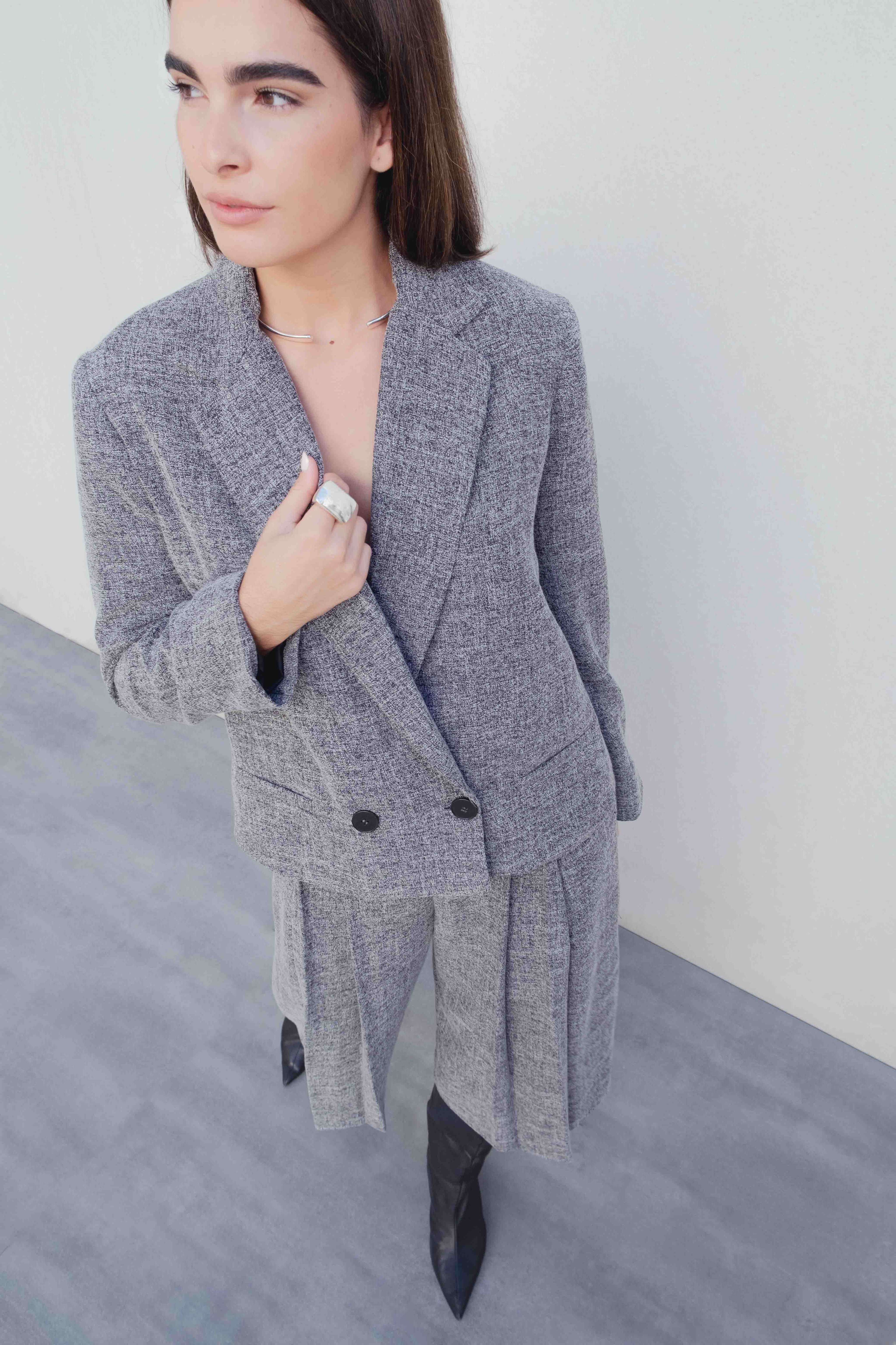 Bermuda de tiro alto y pinzas delanteras. Pernera ancha y corta. Cierre lateral con cremallera oculta en costura.
