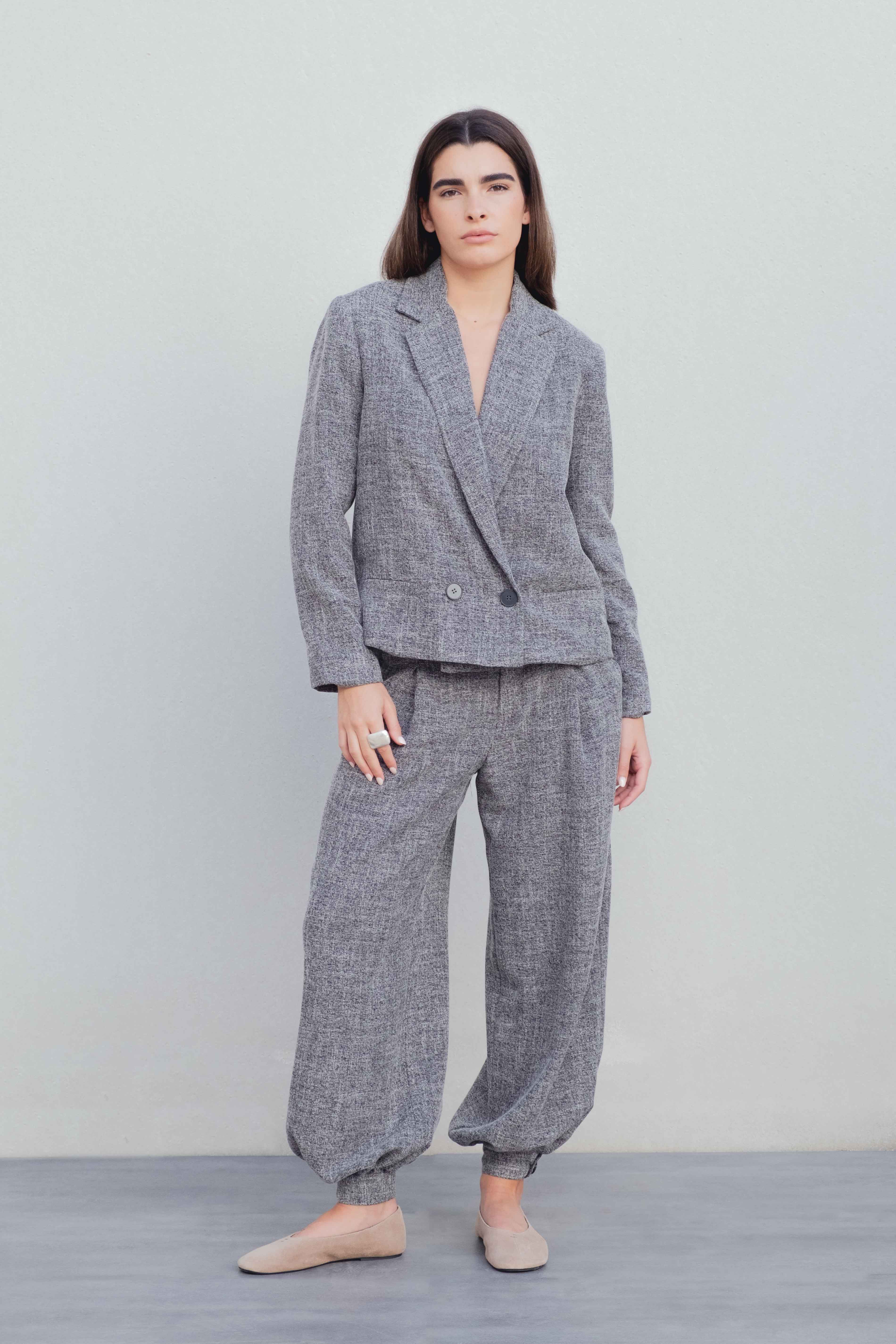 Blazer corta de cuello solapa y manga larga con hombreras. Detalle bolsillos en delantero. Cierre frontal cruzado con botones.