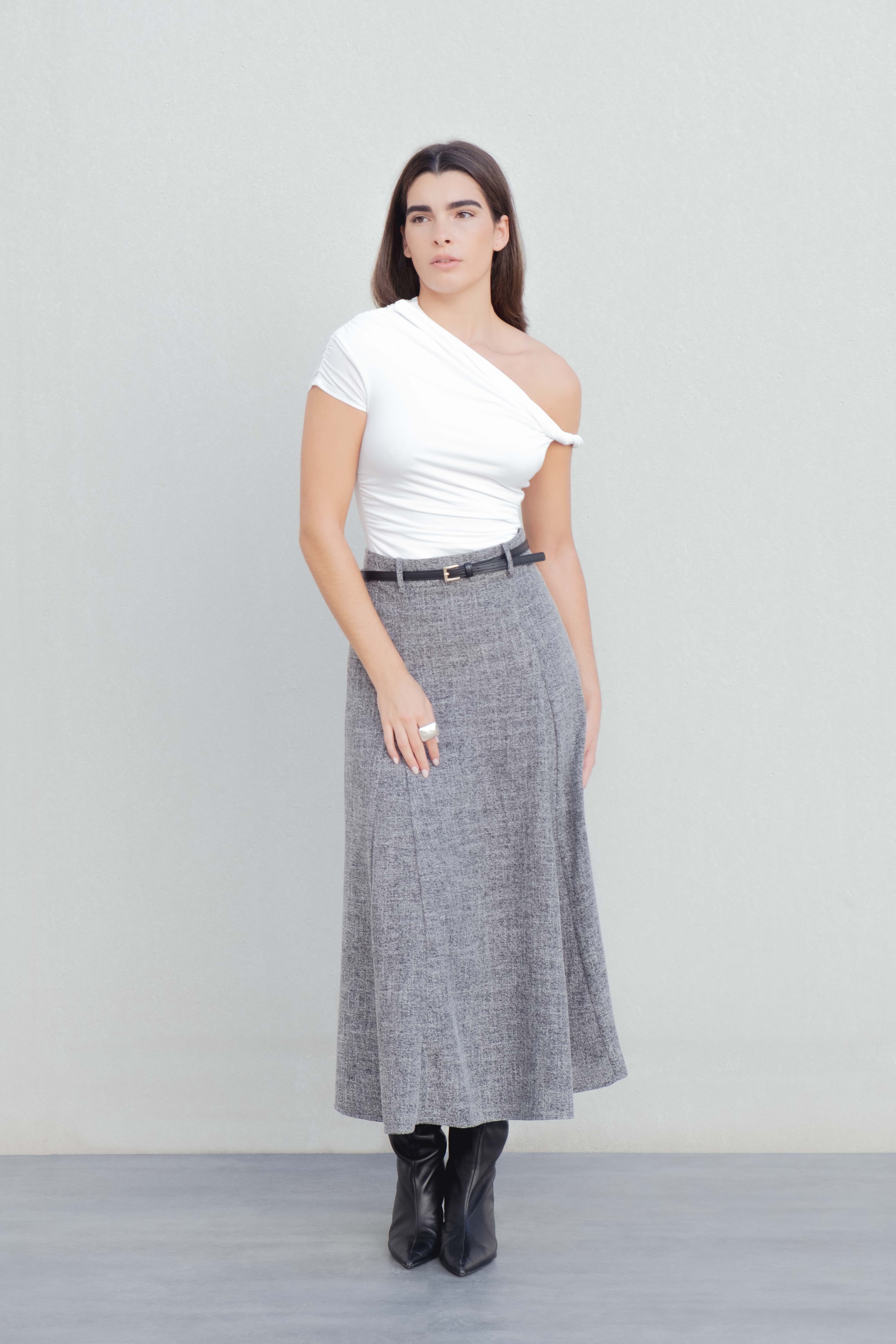 Falda midi de tiro alto con trabillas. Cierre lateral con cremallera oculta en costura.