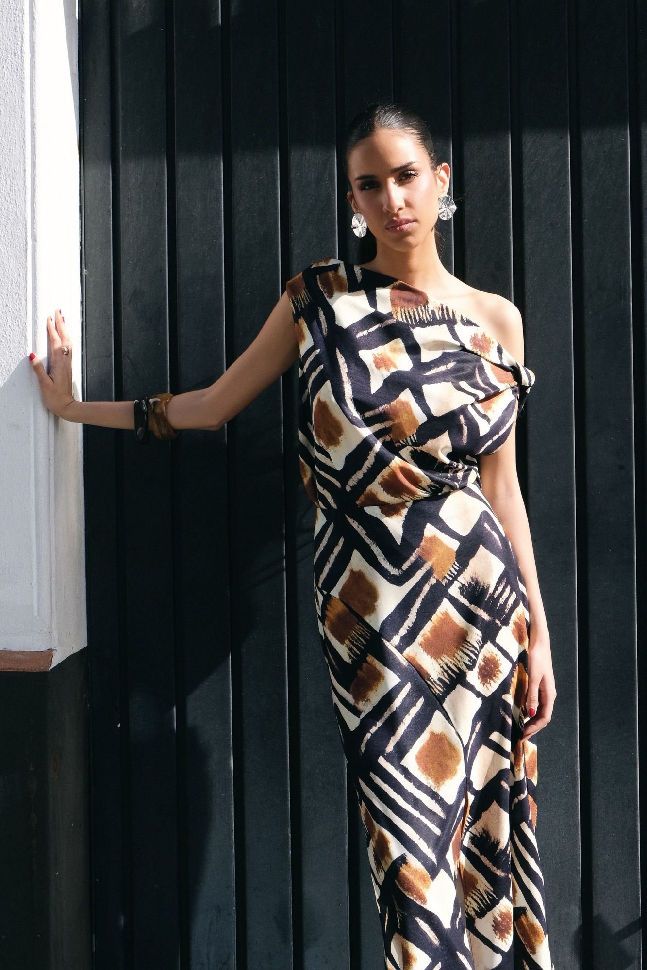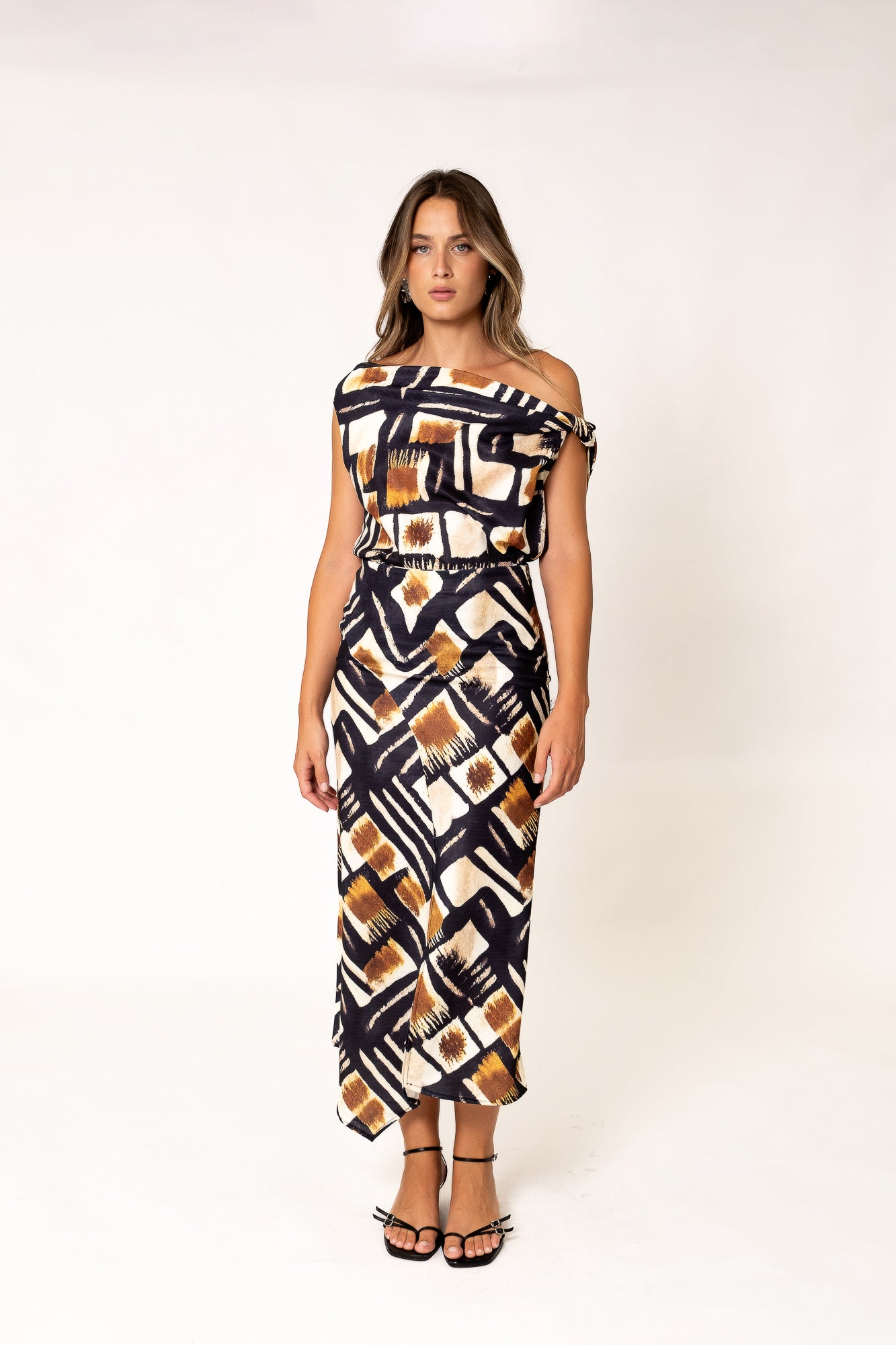 Top de escote asimétrico con manga sisa. Detalle de estampación estilo étnico. Bajo asimétrico.